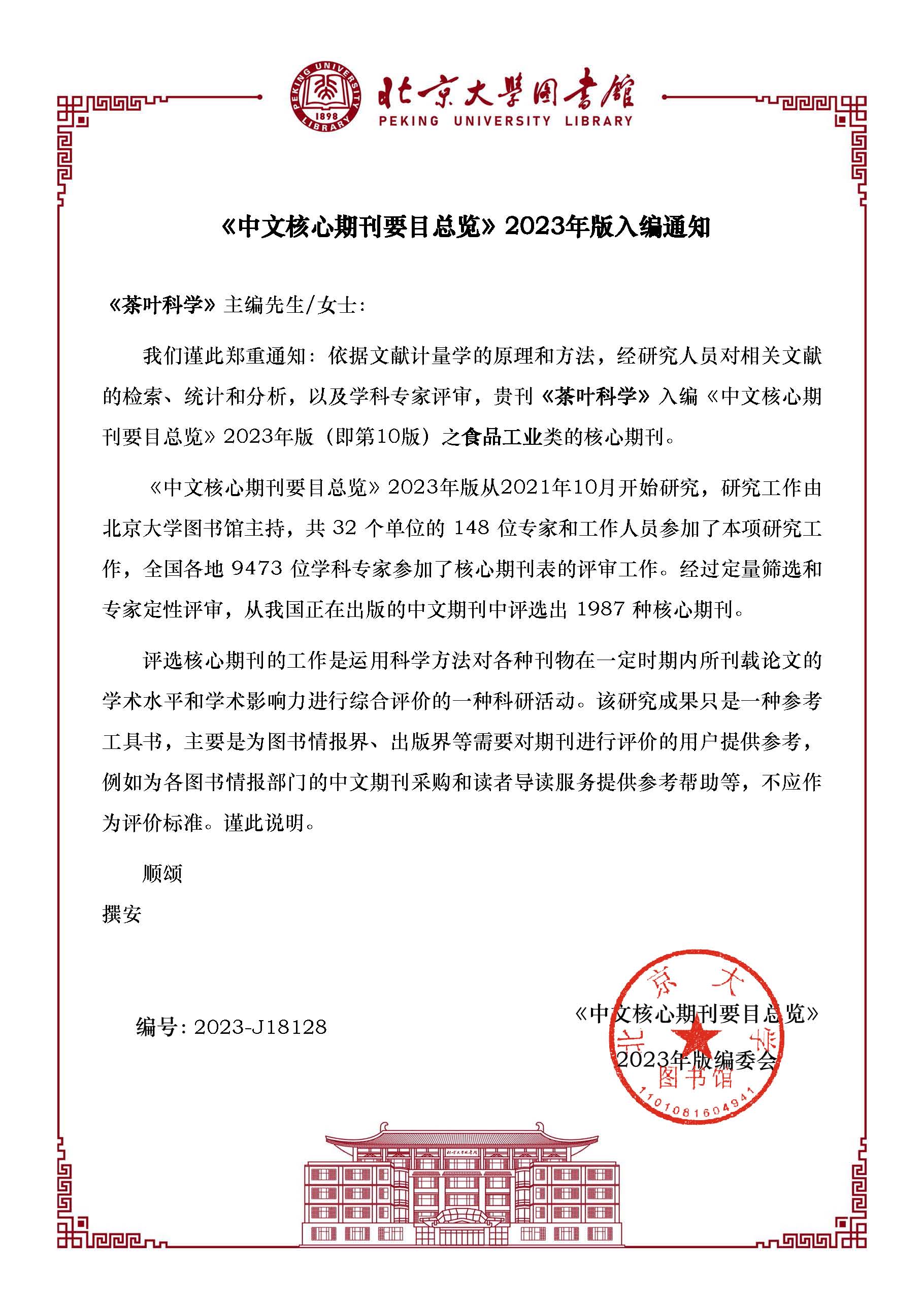 《茶叶科学》继续入编2023版《中文核心期刊要目总览》(即第10版)!