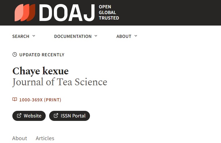 2026年1月4日,《茶叶科学》正式被全球最具影响力的开放获取期刊目录——DOAJ(Directory of Open Access Journals)收录。这一重要进展标志着本刊在质量控制和开放获取政策方面均已达到国际标准,对提升期刊的国际影响力、拓展传播范围、加强学术质量建设具有重要意义。